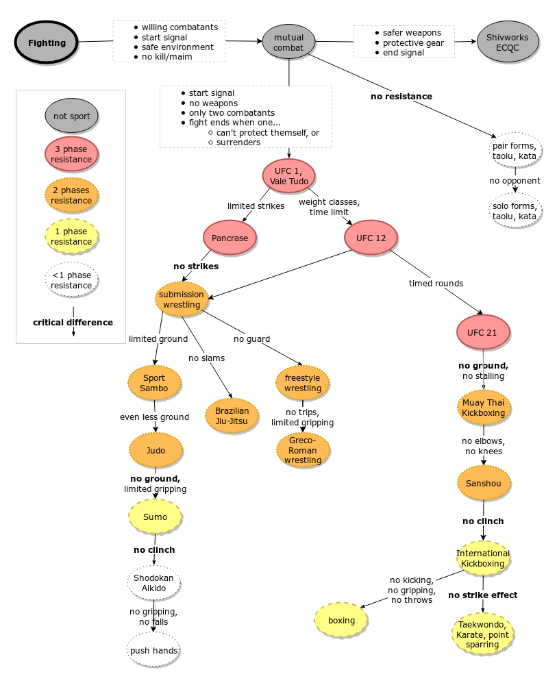One way to look at the relationship between a "real fight" or "street fight" and a fighting sport is to consider the rules, restrictions, and limitations imposed on the competitors. Any student who wants to maximize their training's applicability to fighting must consider how "near" a fighting sport is to a real fight. But if a better chance of survival is the goal, suffering debilitating short- or long-term injury (e.g., traumatic brain injury) in the process of training is counterproductive. Although safe, sustainable training and realistic, fight-like training are competing goals, there is good evidence that some training methods lie in a "Goldilocks" zone where they provide a fair measure of both. In the following graph, nodes (ovals) represent fighting sports and edges (arrows connecting them) represent rules or constraints added to those present in the preceding oval.